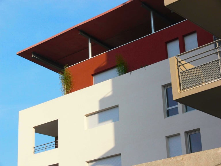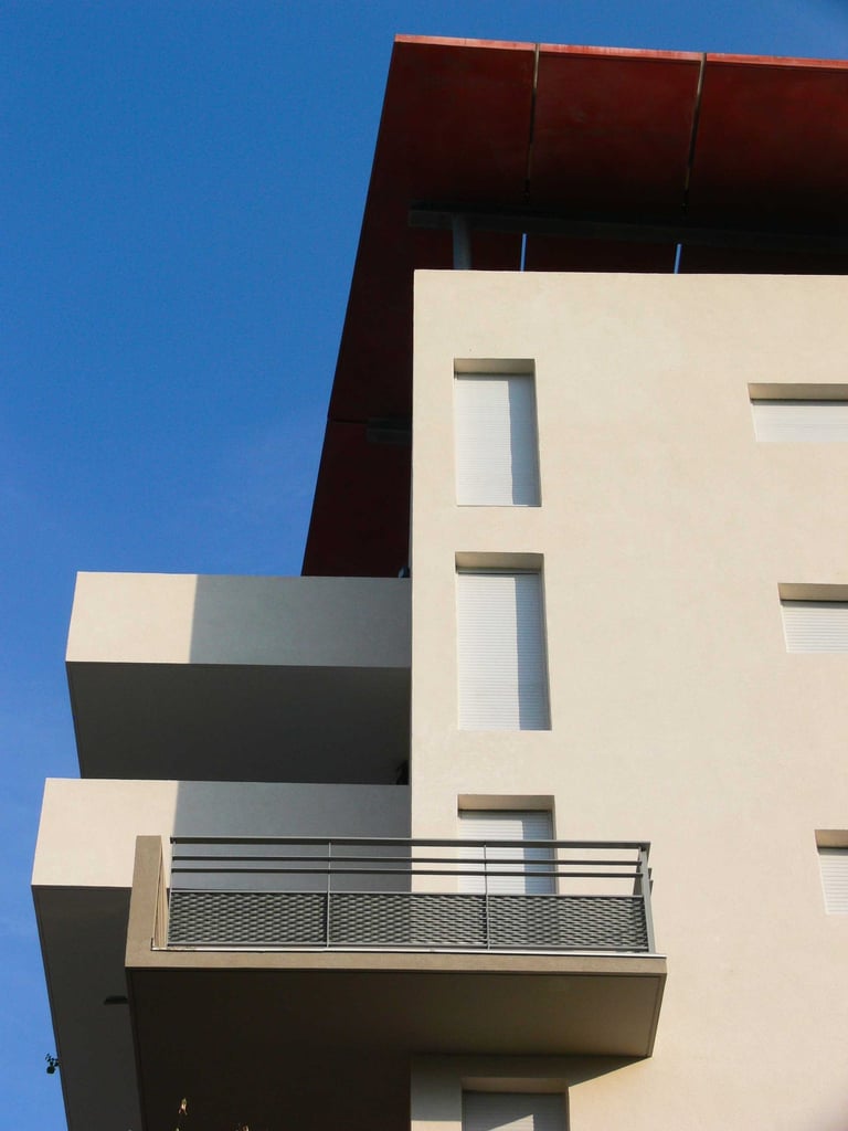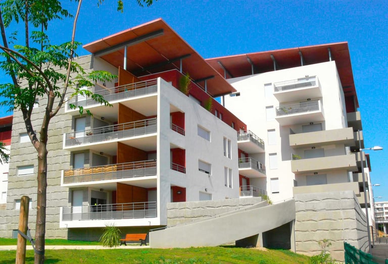 Résidence de 45 logements dans le quartier des Jardins de la Lironde, bâtiments en R+3 et R+6 avec parking sous socle et jardin suspendu.