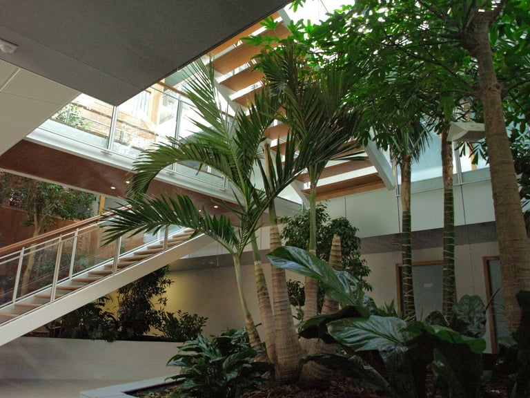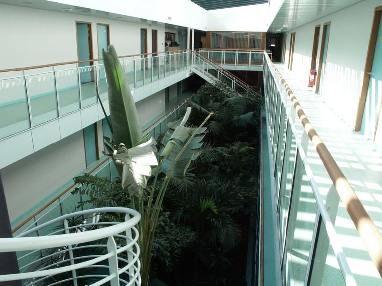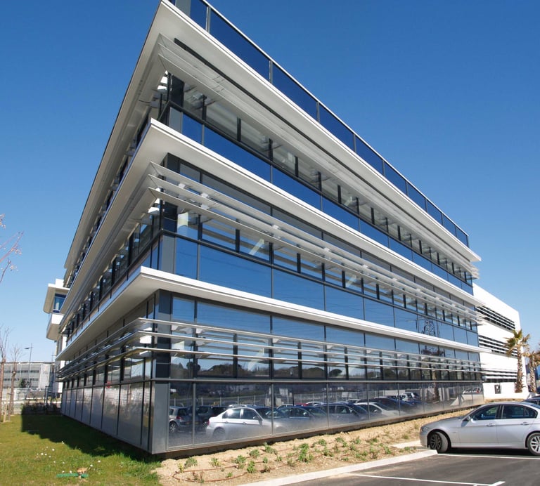 Bâtiment de bureaux en R+2, 3200m2 de plateaux modulables se développant autour d'une serre intérieure sous verrière, parking aérien.