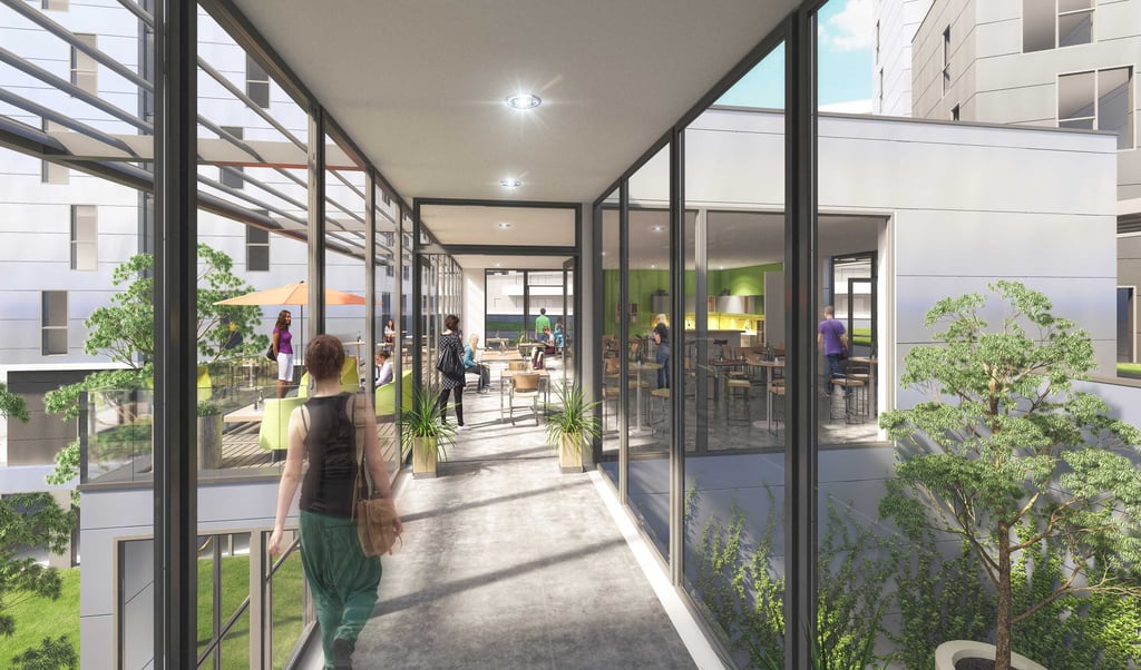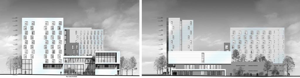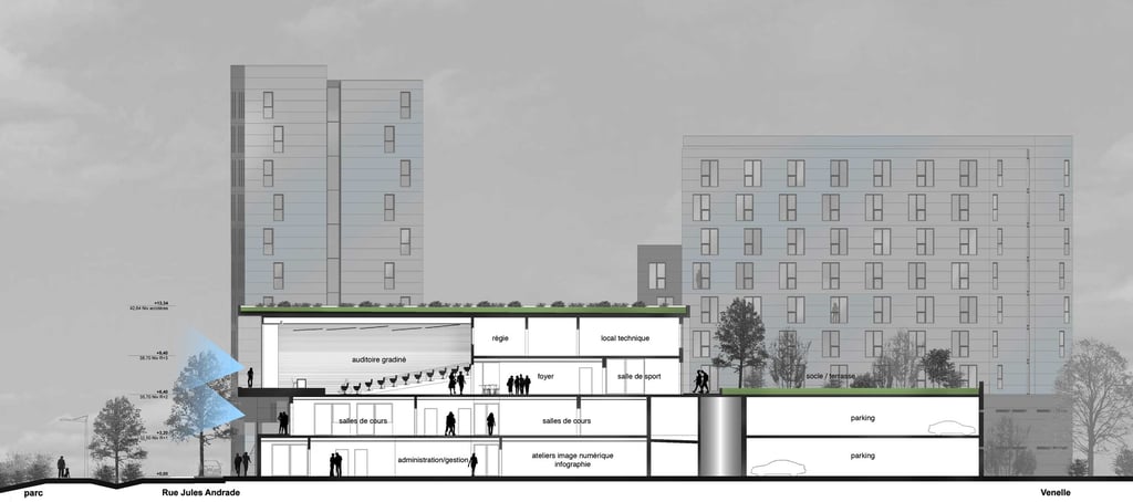 Création d'une école du Groupe Icônes, avec un auditorium, un restaurant et 2 Résidences étudiantes de 190 logements en R+10 et R+8, de 6400 m2 sur parking.